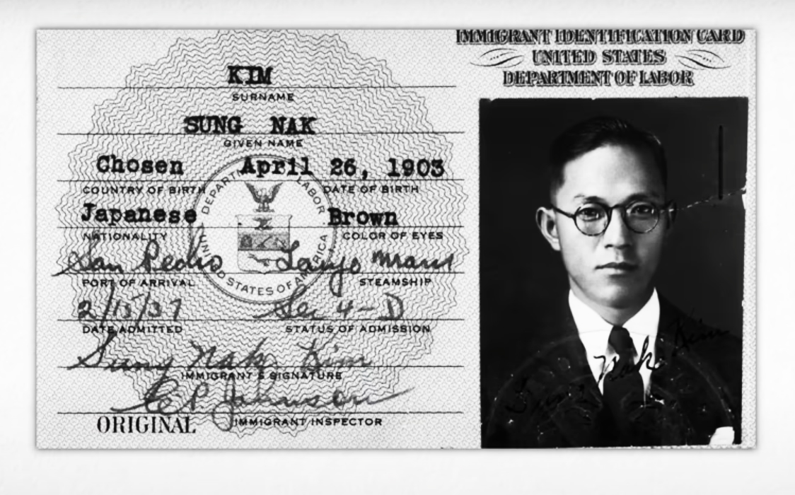 조선인 김성락의 미국입국 허락증(1937). 국적(Nationality)을 '일본인'(Japanese)으로 표기한다.